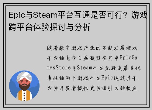 随着数字游戏产业的不断发展,游戏平台的竞争日益激烈。在其中,Epic Games Store与Steam平台无疑是最具代表性的两个游戏平台。Epic通过其平台为开发者提供更具吸引力的收益分成政策,并通过免费游戏等方式快速吸引了大量用户,而Steam则凭借其悠久的历史和庞大的用户基础,仍然占据着市场的主导地位。两者的竞争使得玩家和开发者在选择平台时面临诸多抉择。然而,随着用户对跨平台游戏体验的需求日益增加,Epic与Steam平台是否能够互通,成为了一个值得深思的问题。本文将从四个方面对Epic与Steam平台互通是否可行以及游戏跨平台体验进行探讨与分析,涉及技术实现、用户体验、商业利益和未来发展四个方面。